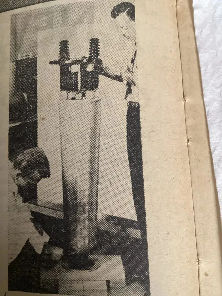 प्रदर्शनी में प्रदर्शन के लिए इंटरनेशनल रेक्टिफायर कंपनी (ग्रेट ब्रिटेन) लिमिटेड द्वारा यहां लाया गया, ऊपर चित्रित सबसे बड़े सिलिकॉन रेक्टिफायर स्टैक में से एक है।