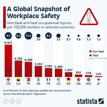 नवीनतम उपलब्ध आंकड़ों के अनुसार आईएलओ (19 फरवरी, 2026 तक), कोस्टा रिका में वर्तमान में काम से संबंधित चोटों की सबसे अधिक संख्या दर्ज की गई है, प्रति 100,000 श्रमिकों पर 9,000 से अधिक गैर-घातक और 9.7 घातक व्यावसायिक चोटें हैं।