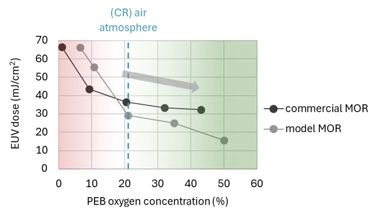 विशेष रूप से, मेटल-ऑक्साइड फोटोरिस्टिस्ट (एमओआर) की बेहतर खुराक प्रतिक्रिया तब हासिल की गई है जब ईयूवी पोस्ट-एक्सपोजर बेक चरण ऊंचे ऑक्सीजन सांद्रता के तहत किया जाता है।