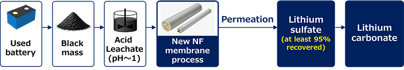 आज तक, टोरे की नैनोफिल्ट्रेशन झिल्लियों ने नमक की झीलों से लिथियम पुनर्प्राप्त किया है। प्रयुक्त लिथियम-आयन बैटरियों के साथ ऐसा करने के लिए अत्यधिक अम्लीय सल्फ्यूरिक एसिड लीचेट को फ़िल्टर करने की आवश्यकता होती है जो उन बैटरियों से धातु निकालता है। पारंपरिक झिल्लियाँ अपर्याप्त रूप से एसिड-प्रतिरोधी होती हैं।