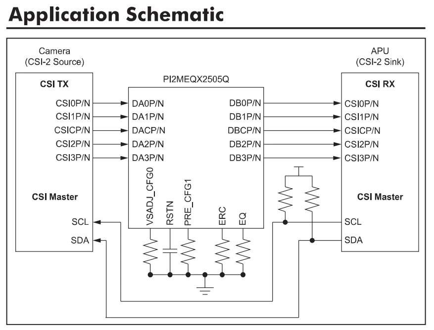 ऊपर दिखाया गया MIPI D-PHY ReDriver एप्लिकेशन योजनाबद्ध भाग से लिया गया है डेटा संक्षिप्त.
