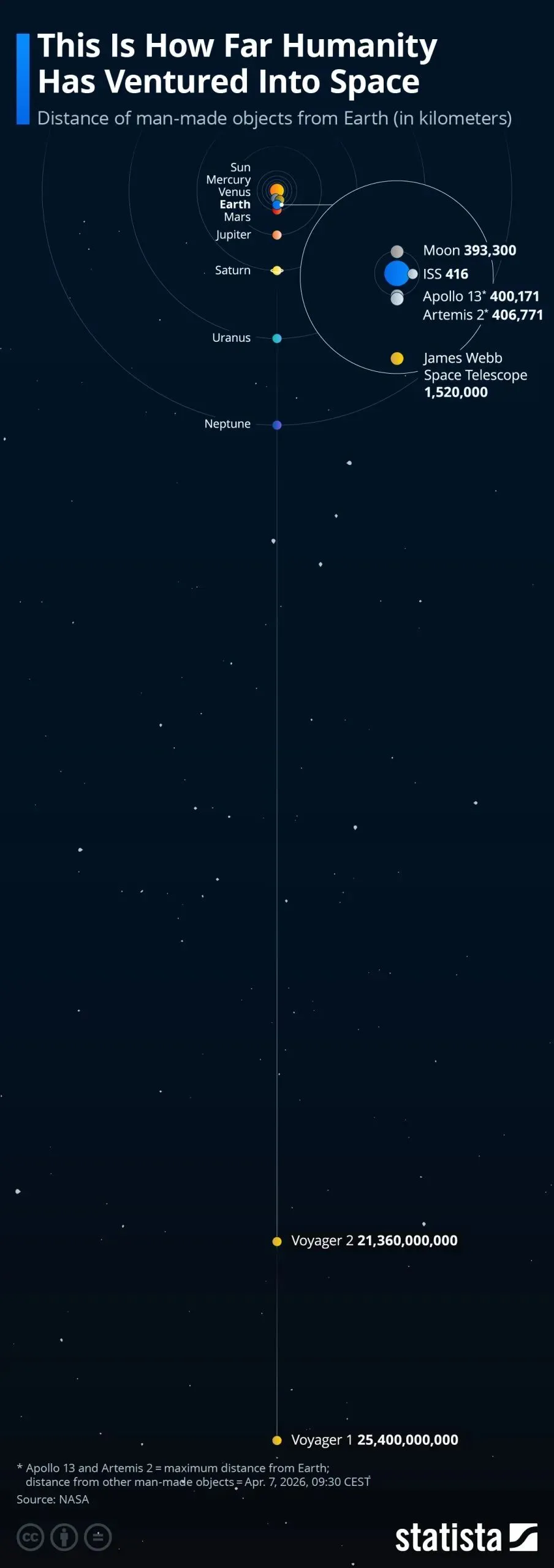 के अनुसार नासामानव निर्मित सबसे दूर की वस्तु वोयाजर 1 है। 1977 में लॉन्च किया गया, यह 7 अप्रैल तक पृथ्वी से लगभग 25.4 बिलियन किमी दूर था। इसका जुड़वां, वोयाजर 2, लगभग 21.36 अरब किमी दूर था। दोनों अंतरिक्ष यान अब सौर मंडल से परे अंतरतारकीय अंतरिक्ष से यात्रा कर रहे हैं।