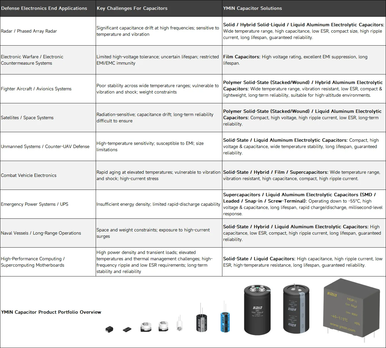 उपरोक्त अंतिम अनुप्रयोगों में संधारित्र चुनौतियों का समाधान करने के लिए, शंघाई YMIN इलेक्ट्रॉनिक्स कंपनी लिमिटेड (YMIN) ऑफर ए उच्च-प्रदर्शन कैपेसिटर की पूरी श्रृंखला (विस्तार करने के लिए छवि पर क्लिक करें):