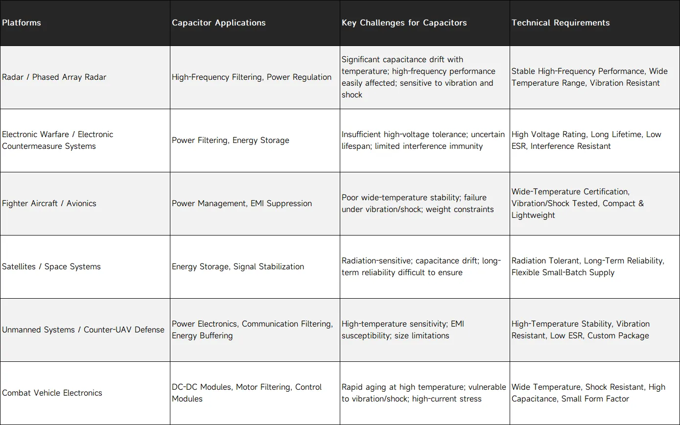 यूरोपीय रक्षा इलेक्ट्रॉनिक्स अनुप्रयोगों में, अंत प्रणालियाँ कैपेसिटर पर कठोर आवश्यकताएं लगाती हैं। विभिन्न प्लेटफार्मों पर, कैपेसिटर को निम्नलिखित विशिष्ट चुनौतियों का सामना करना पड़ता है (विस्तार करने के लिए छवि पर क्लिक करें):