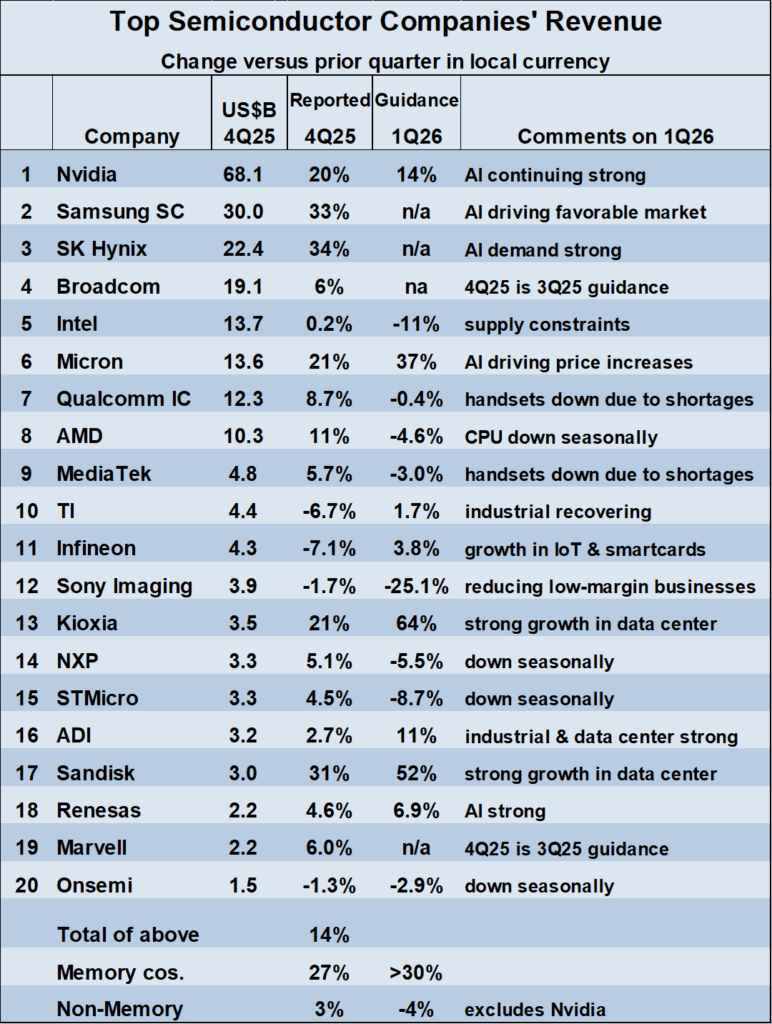 चौथी तिमाही 2025 के नतीजे मिश्रित रहे। मेमोरी कंपनियों ने 3Q 2025 की तुलना में 21% से 34% की सीमा में राजस्व वृद्धि दर्ज की। एनवीडिया 20% ऊपर था। दस कंपनियों का राजस्व 4Q 2025 0.2% से 11% की सीमा में था।