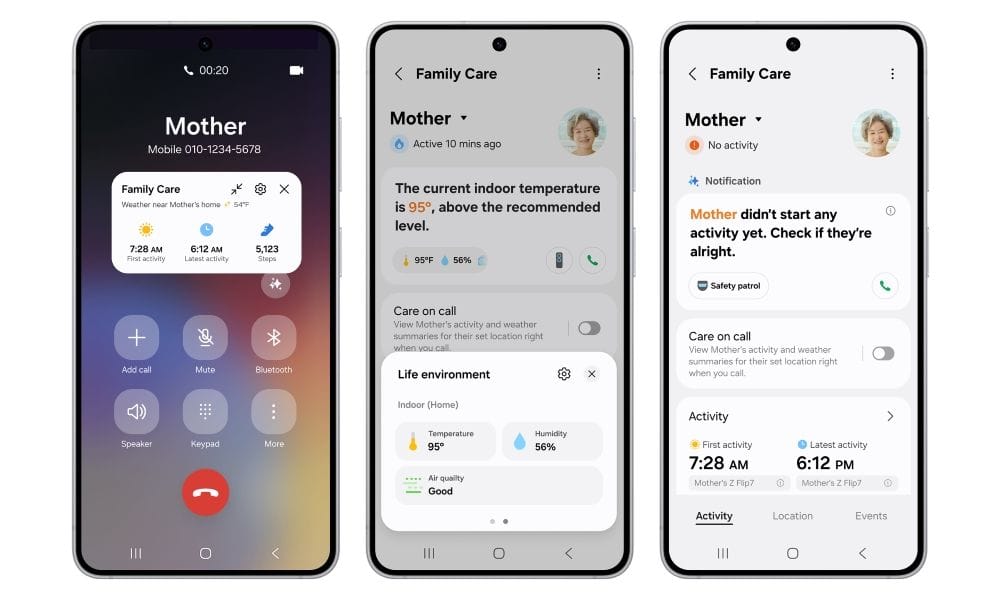 • SAMSUNG फ़ोन कॉल कनेक्ट होने से पहले देखभाल करने वालों के माता-पिता की गतिविधि स्थिति दिखाने के लिए केयर ऑन कॉल लॉन्च किया गया