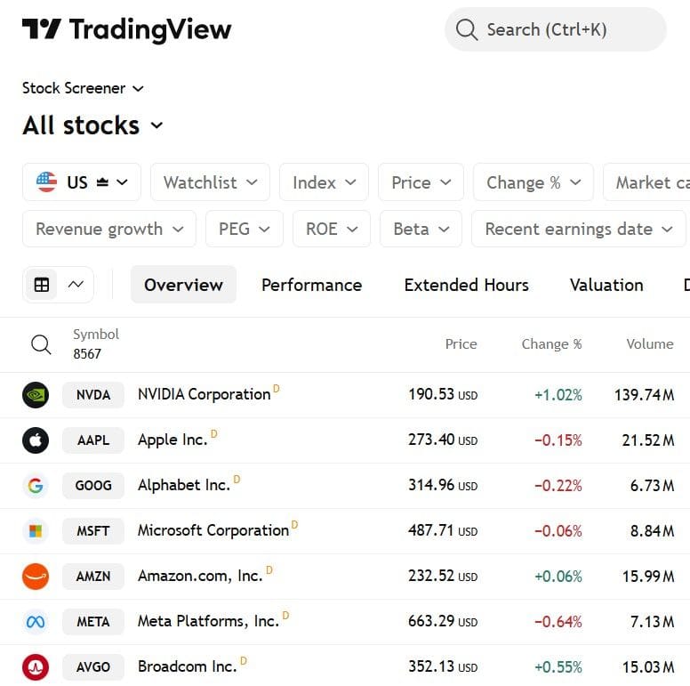 एक स्टॉक स्क्रिनर आपके द्वारा चुने गए फ़िल्टर का उपयोग करके बाज़ार को स्कैन करता है। ये फ़िल्टर मूल्य परिवर्तन, मात्रा, तकनीकी संकेतक या कंपनी के बुनियादी सिद्धांतों पर आधारित हो सकते हैं। लक्ष्य सरल है: उन शेयरों को हटा दें जो आपके लिए मायने नहीं रखते और जो मायने रखते हैं उन्हें उजागर करें।