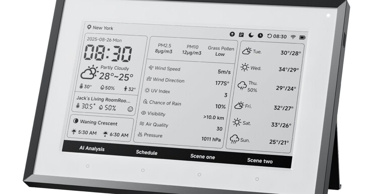 CES 2026 में घोषित स्विचबॉट के सबसे दिलचस्प उत्पादों में से एक इसके सबसे बुनियादी उत्पादों में से एक है। वेदर स्टेशन, जैसा कि इसे कहा जाता है, एक 7.5 इंच की फ्रेम वाली ई इंक स्क्रीन है जो मौसम से संबंधित डेटा से भरी होती है। इसका इंटरफ़ेस दिनांक, समय, मौसम, छह दिन के मौसम का पूर्वानुमान, और सूर्योदय और सूर्यास्त कब होगा, साथ ही इसके अंतर्निहित सेंसर द्वारा एकत्रित किए गए मीट्रिक, जैसे इनडोर तापमान और आर्द्रता सहित जानकारी दिखाता है।