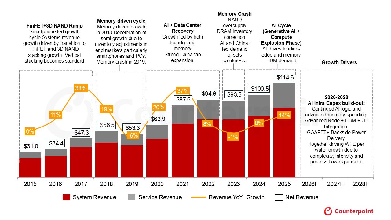 शीर्ष पांच WFE निर्माताओं का राजस्व 2025 में 14% बढ़कर $114 बिलियन हो गया, जो सिस्टम और सेवा राजस्व दोनों में दोहरे अंकों की वृद्धि से प्रेरित है। काउंटरप्वाइंट रिसर्च का वेफर फैब इक्विपमेंट ट्रैकर.