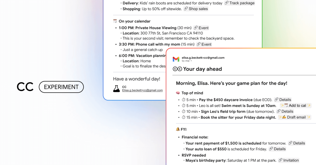 सीसी नामक नई सुविधा, हर सुबह आपके इनबॉक्स में दैनिक “आपका आगे का दिन” ब्रीफिंग भेजती है। वैयक्तिकृत ब्रीफिंग – जिसे Google “एक स्पष्ट सारांश” के रूप में वर्णित करता है – आने वाले दिन के लिए आपके शेड्यूल की रूपरेखा तैयार करता है, साथ ही किसी भी महत्वपूर्ण कार्य या अपडेट के बारे में आपको पता होना चाहिए, जैसे कि आपके द्वारा भुगतान किए जाने वाले बिल या तैयारी के लिए अपॉइंटमेंट। जब आप शीघ्रता से कार्य करना चाहते हैं और दिन की अच्छी शुरुआत करना चाहते हैं तो CC ईमेल ड्राफ्ट और कैलेंडर लिंक भी तैयार कर सकता है।
