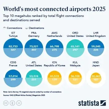 फ्रैंकफर्ट (73,221 कनेक्शन, 307 गंतव्य) दूसरे, शिफोल (66,798 कनेक्शन, 275 गंतव्य) तीसरे और ओ’हेयर चौथे स्थान पर है, जिसमें 65,141 ...